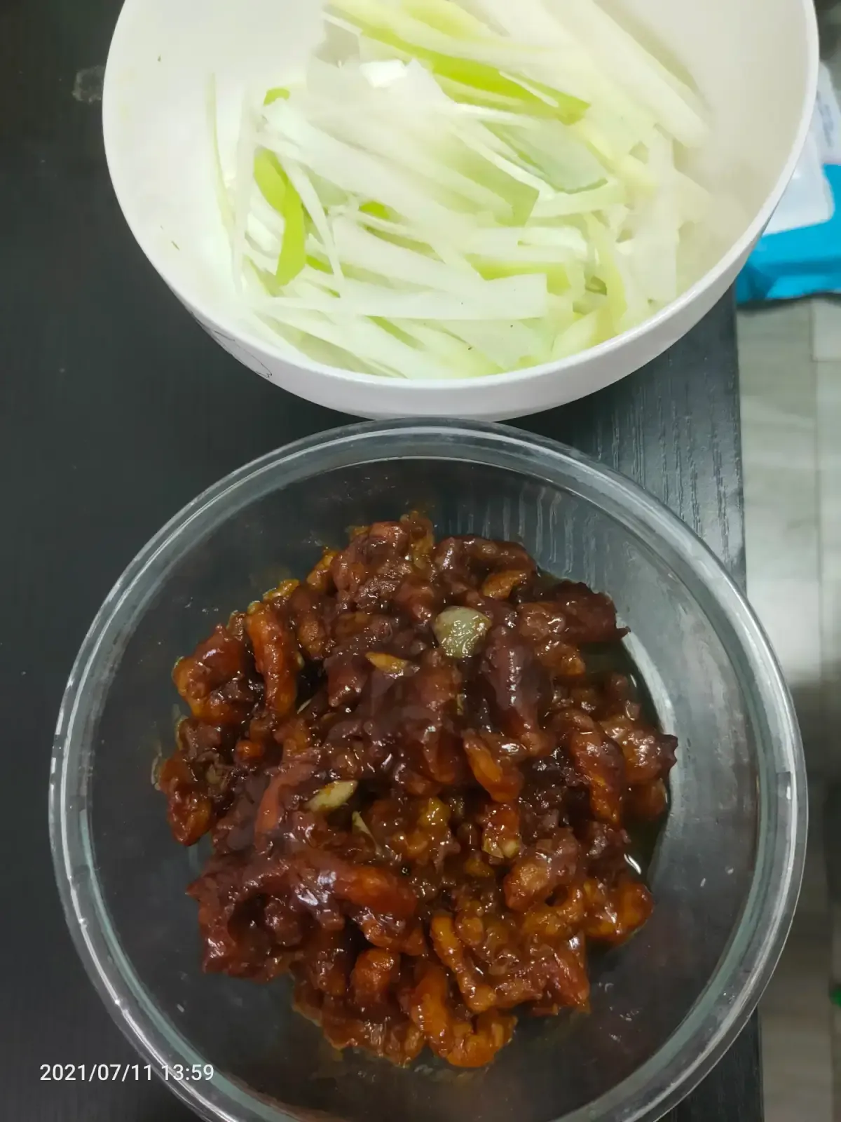 今天在家睡睡睡,早上范下去买了两个大包子,中午11点多做饭,京酱肉丝,和红烧茄子